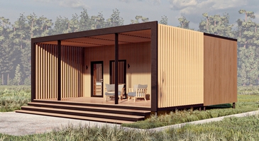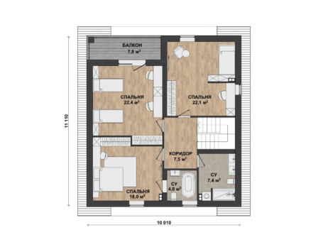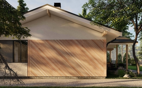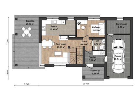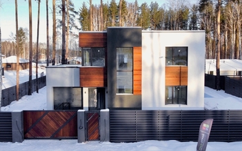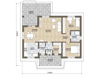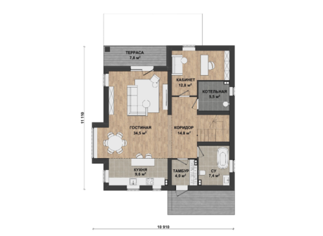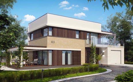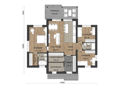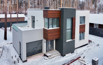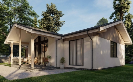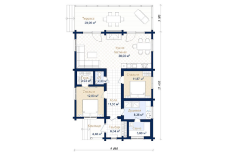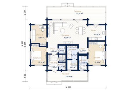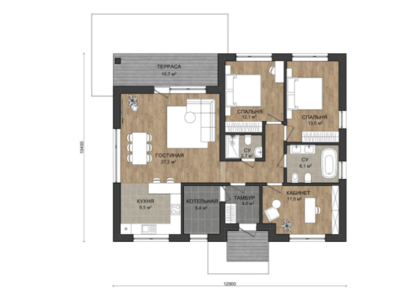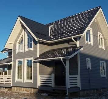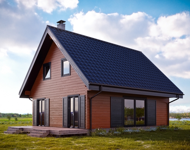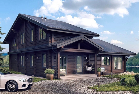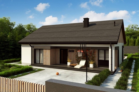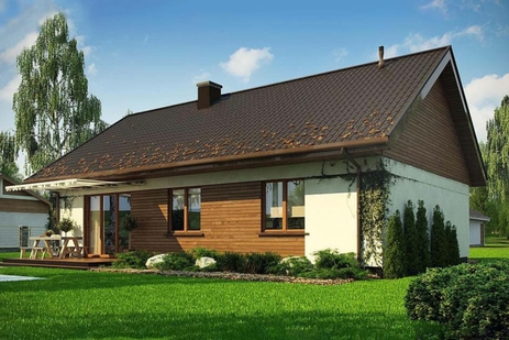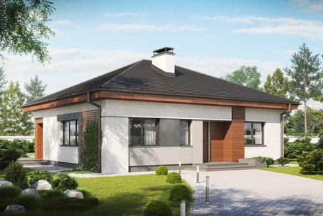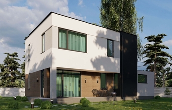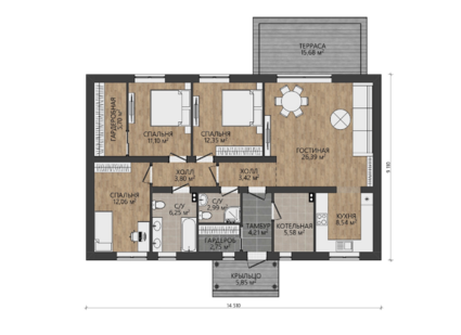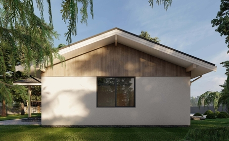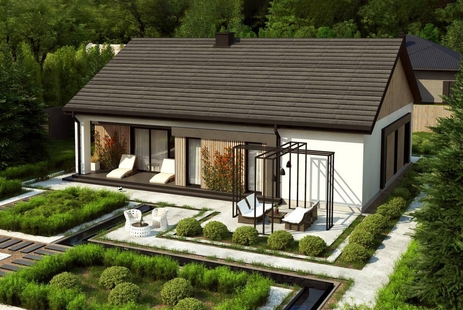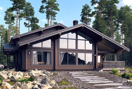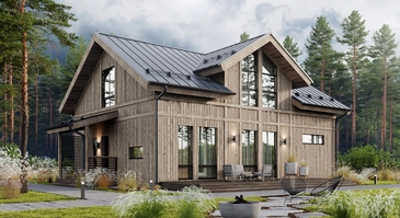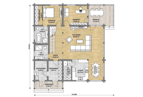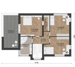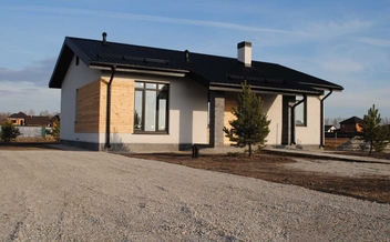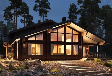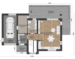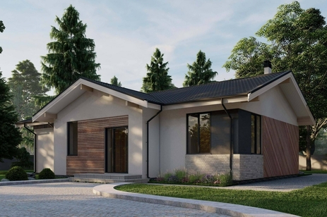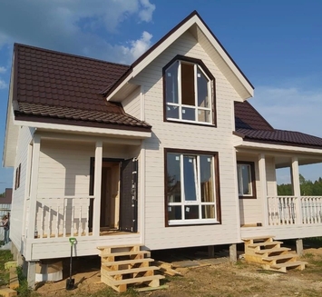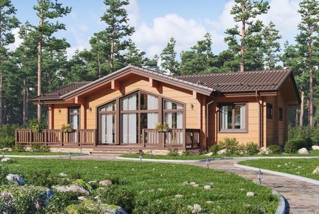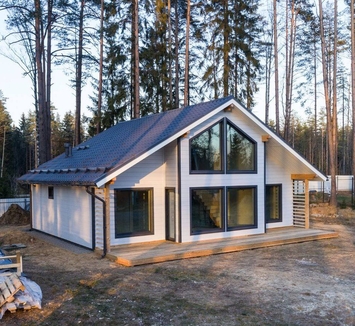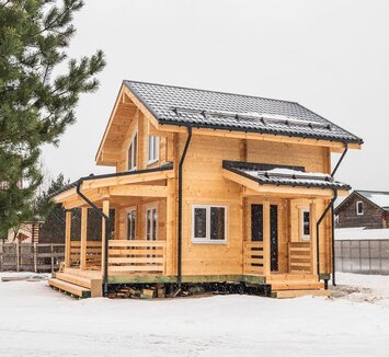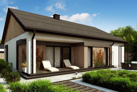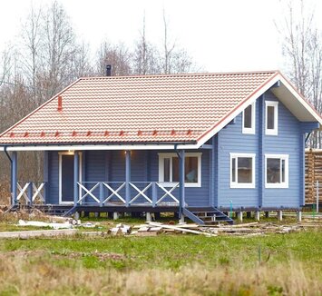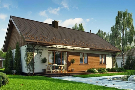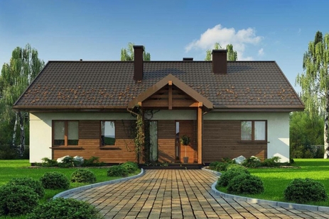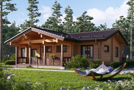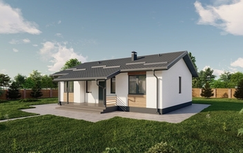 Дома площадью 93 квадратных метра с двухскатной крышей представляет собой просторный и уютный дом для большой семьи. Дом имеет кухню-гостинную, три спальни, две ванные комнаты, гардеробую, техническое помещение, просторную террасу.